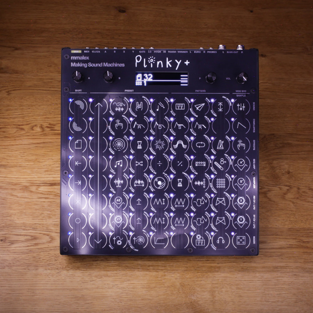 Plinky+ is the extra-large deluxe version of the original Plinky. It is firmware-compatible, and doubles the size of the play surface. Plinky+ comes with a metal enclosure, a clear dustcover, a bigger display, symmetric 6.35mm audio outputs and a printed manual. It includes all the Eurorack I/O of Plinky and the Expander, and comes assembled or as a solderless DIY Kit.